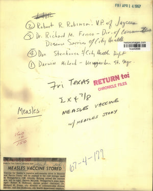 Vaccine for Sunday's massive anti-measles drive in Houston and Harris County will be stacked in the cold storage vault at Weingarten's, 4100 Almeda. Helping unload the vaccine are, left to right, Darwin McLeod, Weingarten's store manager; Robert R. Robinson, Jaycee project chairman; Dr. Richard M. Fenno, city director of communicable disease service, and Don Stenhouse, city health department employee.