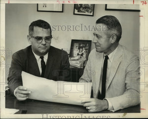 Two members of the Little Rock school board, Ted Lamb, left, and Everett Tucker, the chairman, look over plans for new moves to further court-ordered desegregation in the fall. Slow desegregation goes on without mob violence, but the school board members still undergo harassment and threats. Little Rock, Arkansas. On hammered board.