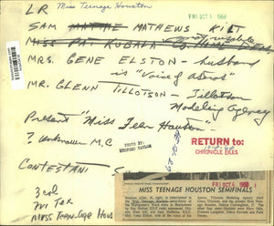Suzanne Allen, 16, right, is interviewed in the Miss Teenage Houston, Texas semi-finals at the Montgomery Ward store in Sharpstown by Ray Norton, KILT radio announcer. Others, from left, are Sam Mathews, KILT, Mrs. gene Elston, wife of the voice of the Astros, Tillotson Modeling Agency chief Glenn Tillotson, and the present Miss Teenage Houston, Debbie Cunningham, 17. The other four semi-finalists were Mary Odle, Frances Langston, Debra Enclade and Patti Owens.