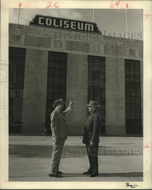 Left, Herman Engel and Wesley Brown talk outside Houston Coliseum. Music Hall, Houston, Texas.