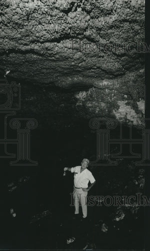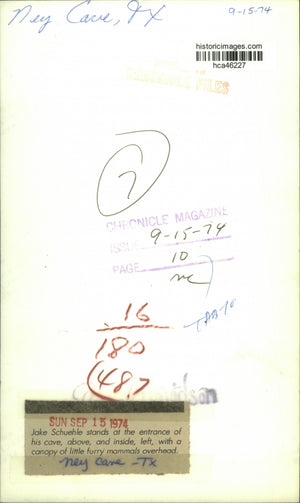 1974 Press Photo Jake Schuehle standing under bats in Ney Cave, TX - hca46227