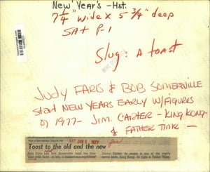 Judy Faris and Bob Somerville toast the New Year with faces. At left, a masked man represents Jimmy Carter, in center is one of the year's movie idols, King Kong. At right is Father Time. New Year's-Houston