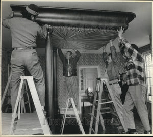 1974 Press Photo Men install Nichols-Rice-Cherry House bed canopy in Houston