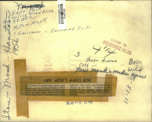 Councilman George Kesseler, center, with scissors, cuts the ribbon formally to open Mosk's new clothing store at main and Rusk, as Fred Mosk, Julius Kornblith, Milton Mosk an J. Grossman look on with approval. the Mosks and Kornbligh are officials of the store. Grossman is an official of the company which makes groshire suits. the store was opened Monday. Mosk's-Houston