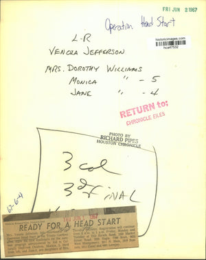Mrs. Venola Jefferson, left, coordinator for Operation Head Start in the Trinity Gardens area, signs the first applicants for the summer program administered by Aid to Culturally Deprived Children. Monica, 5, third from left, and Jane, 4, are daughters of Mrs. Dorothy Williams. Registration will continue from 8 a.m. to 5 p.m. Friday, Monday and Tuesday at 7313 Hirsch Road, 1252 Market Street Road, 2322 Nagle, 7709 Scott, 6633 West Montgomery, 2211 North Main, 1919 Runnels, 2411 Canal and 4401 Lovejoy. Operation Head Start, Houston, Texas. family.