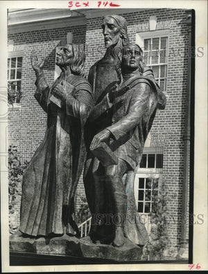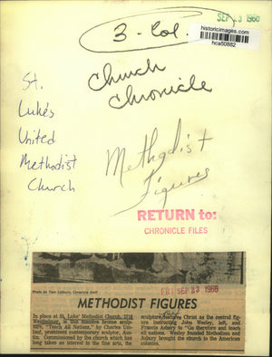 In place at St. Luke's Methodist Church, 3718 Westheimer, is this massive bronze sculpture "Teach All Nations," by Charles Umlauf, prominent contemporary sculptor, Austin. Commissioned by the church which has long taken an interest in the fine arts, the sculpture features Christ as the central figure instructing John Wesley, left, and Francis Asbury to "Go therefore and teach all nations. Wesley founded Methodism and Asbury brought the church to the American colonies. Church Chronicle - Methodist Figures - St. Luke's United Methodist Church