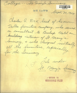 Charles G. Rick, head of his own Dallas furniture company, who served as consultant to Bishop Nold on interior of St. Mary's Seminary, and who designed virtually all the furniture, especially for the Seminary in Houston, Texas.
