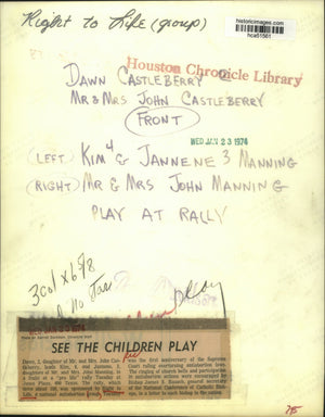 Dawn, 2, daughter of Mr. and Mrs. John Castleberry, leads Kim, 4, and Jannene, 3, daughters of Mr. and Mrs. John Manning, in a frolic at a "pro life" rally Tuesday at Jones Plaza, 600 Texas. The rally, which drew about 150, was sponsored by Right to Life, a national antiabortion group. Tuesday was the first anniversary of the Supreme Court ruling overturning antiabortion laws. The ringing of church bells and participation in antiabortion actions were encouraged by Bishop James S. Rausch, general secretary of the National Conference of Catholic Bishops, in a letter to each bishop in the nation. Right to Life (group)