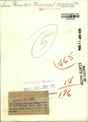 Sam Houston Memorial Museum director Sue Flanagan shows where she mended pickets before crack film crew arrived. Sam Houston Memorial Museum