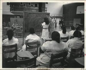 Compulsory class - by law, illiterates must be taught to third grade - gets lesson from matron Beaulah Mae Starns at Texas Department of Corrections Goree State Prison for Women, Huntsville.