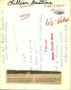 Lillian Bastine - Lillian Bastine, United Fund's Volunteer of the Year shows off trophy, in exchange for a "report card" presented by students Janine Dunn, 5, (left) and Chris Baker, 4, of Drew Allen Day Care Center. Bastine is a regular visitor at United Fund installations.