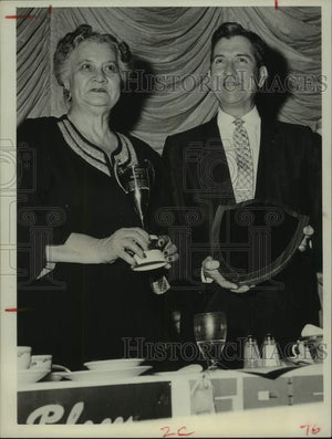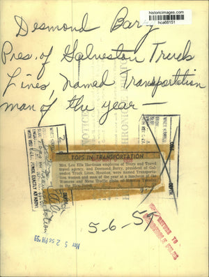 Tops in transportation...Mrs. Lou Ella Hardman, employee of Tours and Travel travel agency, an Desmond Barry, president of Galveston Truck Lines, Houston, Texas, were named Transportation Woman and Man of the Year at a luncheon of the Womens and Mens Traffic clubs of Houston Tuesday in the Rice Hotel.