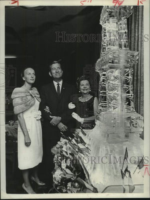 The icy Eiffel Tower makes French Night a cool one at World Trade Club in Houston, Texas. Admiring the sculpture are Mrs. Yves Rodrigues and Mr. and Mrs. Desmond Barry.