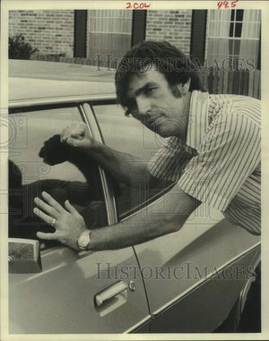 1974 Press Photo Gerald Barr Demonstrates Beating on Officer Rodriguez's Car