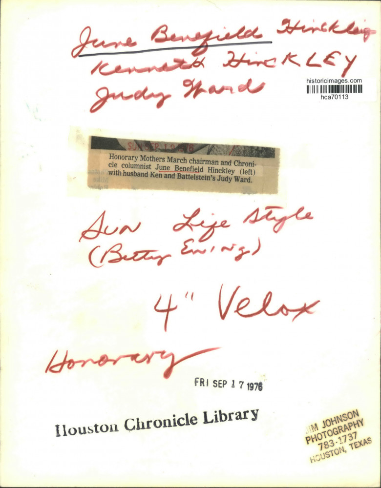 Honorary Mothers March chairman and Chronicle columnist June Benefield Hinckley (left) with husband Ken and Battelstein's Judy Ward.