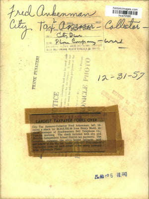 Fred Ankenman - City Tax Assessor-Collector - Largest Tax payer Forks Over - City Tax Assessor-Collector Fred Ankenamn, left, receives a check for $2,013,735.48 from Henry Mudd, division manager of Southwestern Bell Telephone Co. Tuesday morning. The check included both City and Houston Independent School District tax payments. The telephone company, the city's largest taxpayer, paid $67,839.60 on the city tax "under protest." This amount represents taxes on land owned in the newly annexed area.