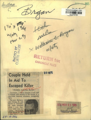 Couple held in aid to escaped killer. Galveston - Police charged a man and a woman with helping in the escape of a convicted Houston murderer recaptured here. The pair, Barbara Ann Crump, 36, and Bryon O. Garrison, 34, were arrested about 3 a.m. Sunday with the escapee, William Clark Bryan Jr., 36. William C. Bryan.