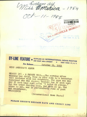 The morning after winning the title of Miss America of 1954, Evelyn Margaret Ay sits down to a breakfast that included milk and doughnuts. She says she was surprised she was chosen, because her 37-inch bust and 36-inch hips must prove "I bulge in places." But she tried dieting once and gave it up. She likes to eat and is particularly fond of pork and sauerkraut.