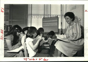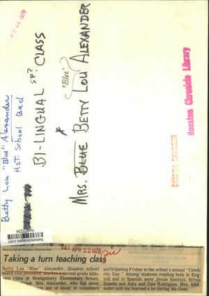 Betty Lou "Blue" Alexander, Houston school board vice president, teaches a second-grade bilingual class at Montgomery Elementary School. Mrs. Alexander, who has never... one of about 54 volunteers participating Friday in the school's annual "Celebrity Day." Among students reading both in English and in Spanish were Jessie Santoya, Sylvia Zepeda and Julia and Jose Rodriguez. Mrs. Alexander said she learned a lot during the class.