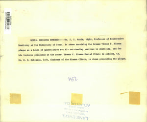Dental educator honored - Dr. S.S. Arnim, right, Professor of Restorative Dentistry at the University of Texas, is shown receiving the bronze Thomas P. Hinman plaque as a token of appreciation for his outstanding services to dentistry, and for his lectures presented at the recent Thomas P. Hinman Dental Clinic in Atlanta, Georgia. Dr. R.D. Robinson, left, Chairman of the Hinman Clinic, is shown presenting the plaque.