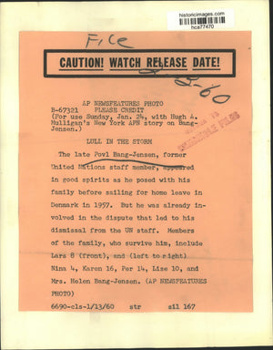 Lull in the storm. The late Povl Bang-Jensen, former United Nations staff member, appeared in good spirits as he posed with his family before sailing for home leave in Denmark in 1957. But he was already involved in the dispute that led to his dismissal from the UN staff. Members of the family, who survive him, include Lars 8 (front), and (left to right) Nina 4, Karen 16, Per 14, Lise 10, and Mrs. Helen Bang-Jensen.