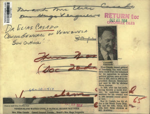 Venezuelans waited until political season was over. Mrs. Elias Casado, Consul General Casado, Brazil's Mrs. Hugo Vergueiro. Elias Casado, consul general of Venezuela, has been exiled three times from his homeland for his opposition to certain political parties, once as a student in 1937, once in 1945 by ex-president Romulo Betancourt and once in 1951 by dictator Perez Jiminez. In 1958, after his last exile, having become a world traveler, he undertook special missions for his country and in 1964 became consul general here.