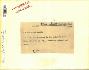 The Carpenter Family Left to right Candace, 2 (on mother's lap); Rene; Kristen, 3; Jay, 7 (wearing helmet) and Scott, 9.
