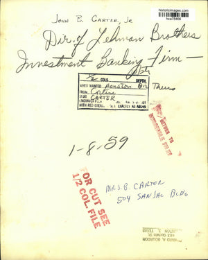 1959 Press Photo Director John B. Carter, Jr. of Lehman Brothers Banking Firm
