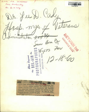 Each year at Christmas, Gordon's Jewelers donates watches and jewelry to hospitalized veterans here. Paul Smolensky, left, Houston area supervisor, presents watches and jewelry to the Veterans Administration Hospital. Doctor Lee D. Cady, hospital manager accepts the gifts.