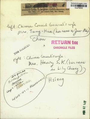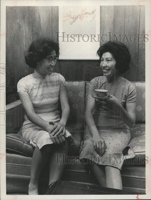 Left: Chinese Consul General's wife Jun-Mei (Mrs. Tung-Hua) Chou and Chinese Consul's wife Lily Chiang (Mrs. Henry S.K.) Hsiang, relax after Sharpstown Center shopping trip in Houston, Texas.
