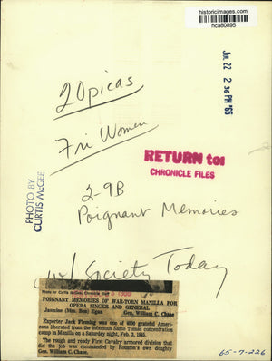 Poignant memories of war-torn Manila for opera singer and General. Jasmine (Mrs. Ben) Egan and General William C. Chase. Exporter Jack Fleming was one of 4000 grateful Americans liberated from the infamous Santo Tomas concentration camp in Manila on a Saturday night, February 3, 1945. The rough and ready First Cavalry armored division that did the job was commanded by Houston's own doughty General William C. Chase.