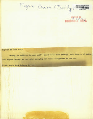 "Mommy, is Daddy on the moon yet?" asked Teresa Dawn (Tracy), only daughter of astronaut Eugene Cernan, as the rocket carrying her father disappeared in the sky. Eugene Cernan (Family)
