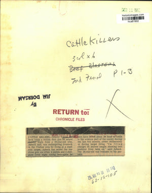 Cattle Killers - Deputy Carlie Asbeck holds a British Sten gun he seized Sunday night from a 16-year-old who, Asbeck said, was endangering livestock in the Clodine area by firing at a roadside target. Asbeck has seized the machine gun, six rifles, 4 pistols and 2 shotguns from night riding teenagers he says have killed about 20 head of cattle in the western part of the county during the last two months, either deliberately or during target firing. "I'm filing charges on anyone caught shooting into pastures from here on," said Asbeck. The 16-year-old- was released to his parents. Cattle killers. Beef blasters.