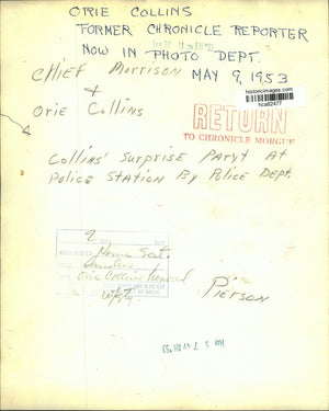 Orie Collins, Former Chronicle reporter now in photo department. Chief Morrison and Orie Collins. Collins surprise party at police station by police department.