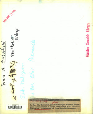 The Rev. Olav Parnamets, pastor of the largest methodist congregation on the continent of Europe, looks through a gift Bible with Bishop Finis A. Crutchfield of the Texas Methodist Conference.