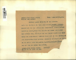 Curran lauds efforts of Communists. Although denying he was a Communist, Joseph Curran, leader of the Committee for Industrial Organization Maritime Union, told the Senate commerce and labor committees February 17 that the Communist party had done more for industrial workers than any of the so-called and self-appointed Liberal agencies existent to date. He is shown with Senator Royal S. Copeland (left) (D-NY) man of the Commerce Committee.