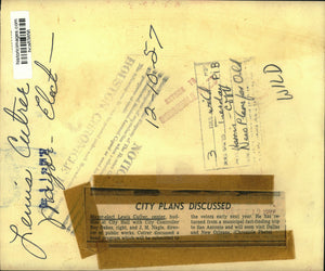 Mayor-elect Lewis Cutrer, center, huddles at City Hall with City Controller Roy Oakes, right and J.M. Nagle, director of public works, Cutrer discussed a bond program which will be submitted to the voters early next year, He has returned from a municipal fact-finding trip to San Antonio and will soon visit Dallas and New Orleans, (Chronicle Photo)