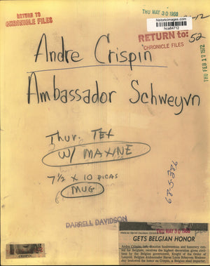 Andre Crispin, left, Houston businessman and honorary consul for Belgium, receives the highest decoration given civilians by the Belgian government, Knight of the Order of Leopold. Belgian Ambassador Baron Louis Scheyven Wednesday bestowed the honor on Crispin, a Belgian steel importer.