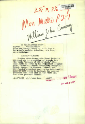 1977 Press Photo William John Conway, Roman Catholic cardinal, Armagh, Ireland