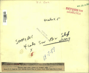 Sentry dog "Pan" leaps at dummy arm. Owner R. C. Cook Sr., left, agitates guard dog as trainer Victor King holds him in check
