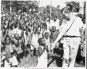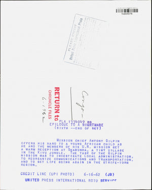 Congo - Mission chief Antony Gilpin offers his hand to a young African child as he and the members of his U.N. Mission get a warm reception at Shabunda, a tiny village in the Kivu jungle. The task of the Gilpin mission was to investigate local administration, to reorganize communications and transportation, and get life going again in the strife-torn region.