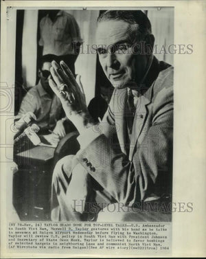 United States (U.S.) Ambassador to South Viet Nam (Vietnam), Maxwell D. Taylor gestures with his hand as he talks to newsmen at Saigon airport Wednesday before flying to Washington, D. C. Taylor will review U.S. policy in South Viet Nam with President Johnson and Secretary of State Dean Rusk. Taylor is believed to favor bombings of selected targets in neighboring Laos and communist North Viet Nam.
