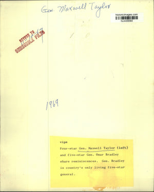 VIP's. Four-star General Maxwell Taylor (left) and five-star General Omar Bradley share reminiscences. General Bradly is country's only living five-star general. visit at event.