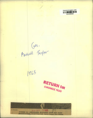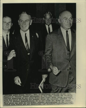 Los Altos Hills, California - General Maxwell D. Taylor, former ambassador to Viet Nam (Vietnam), leaves the Foothill College gymnasium at Los Altos Hills last night after being spattered with red paint following his speech. Paint was believed intended for a group of student demonstrators. It is not know who threw the paint. This photo was made by Jim Koski, student photographer at the college. Others with Taylor are not identified. ...hit with paint after speech. CA.