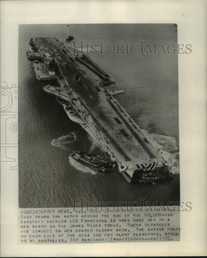 Newport News, Virginia - Tugs churn the water around the bow of the 60,000-ton aircraft carrier USS Forrestal as they move her to a new berth in the James River today. Steam catapults are exposed on her canted flight deck. The gaping holes on each side of the deck are for plane elevators, still to be installed. S. S. - U.S.S.