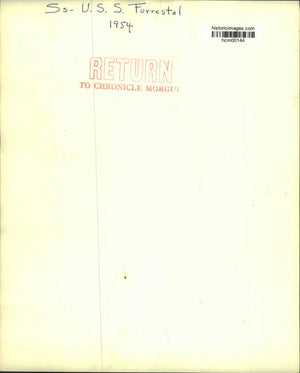 1954 Press Photo Aircraft carrier USS Forrestal moves to James River berth