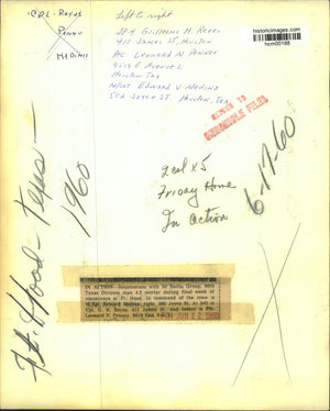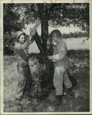 In action - Houstonians with 3rd Battle Group, 90th Texas Division man 4.2 mortar during final week of maneuvers at Fort Hood. In command of the crew is Master Sergeant Edward Medina, right, 502 Joyce Street. At left is Corporal G. H. Reyes, 411 James St., and center is Private First Class Leonard N. Penney, 9519 East Avenue L. Pfc. M/Sgt. Ft. Hood. Texas.