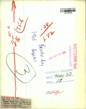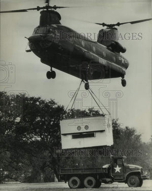 1965 Press Photo Helicopter hoists inflatable hospital; Brooke Army Medical, TX