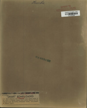 Armorers lift a 500-pound laser-guided bomb to wing of an American bomber recently on the carrier, USS America, on station off the Vietnam coast. Aircraft from the carrier drop the bombs, nicknamed "smart" bombs, on pinpoint targets in Vietnam. United States (U.S.) Navy.