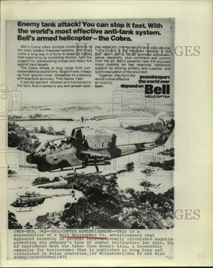 Helicopter advertisement - This is a reproduction of a Bell Helicopter Co. advertisement that appeared recently in several internationally circulated magazines promoting the company's line of combat helicopters for sale. The ad reproduced here was taken from Modern Asia, a bi-monthly magazine for businessmen that is published in Hong Kong and circulated in Asian countries. "Enemy tank attack! You can stop it fast. With the world's most effective anti-tank system. Bell's armed helicopter - the Cobra.
